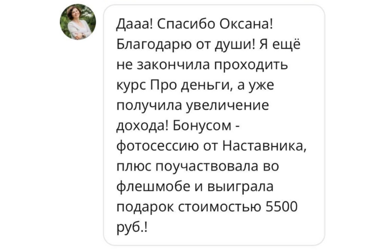 Я еще не закончила проходить курс "Pro Деньги", а уже получила увеличение дохода! Бонусом - фотосессию от Наставника, плюс поучаствовала во флешмобе и выиграла подарок стоимость 5500 руб!