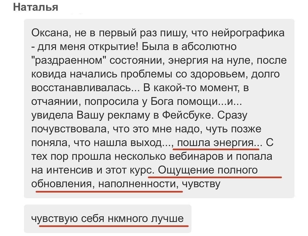 С тех пор прошла несколько вебинаров и попала на интенсив и этот курс. Ощущение полного обновления, наполненности, чувству чувствую себя намного лучше.