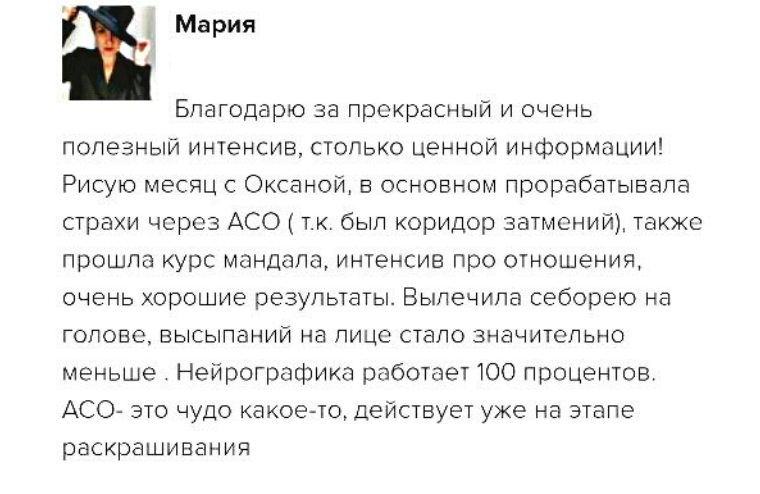 Благодарю за прекрасный и очень полезный интенсив, столько ценной информации! Рисую месяц с Оксаной, в основном прорабатывала страхи через АСО (т.к. был коридор затмений), также прошла курс "НейроМандала", интенсив "PRO Отношения", очень хорошие результаты. Вылечила себорею на голове, высыпаний на лице стало значительно меньше.