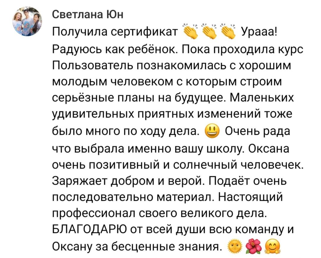 Очень рада, что выбрала именно вашу школу. Оксана очень позитивный и солнечный человечек. Заряжает добром и верой. Подаёт очень последовательно материал. Настоящий профессионал своего великого дела. БЛАГОДАРЮ от всей души всю команду и Оксану за бесценные знания.