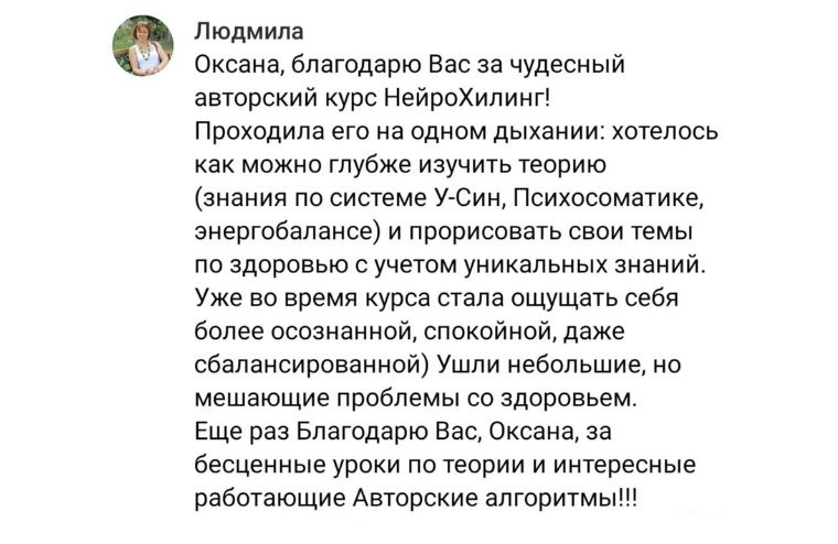 Уже во время курса стала ощущать себя более осознанной, спокойной, даже сбалансированной) Ушли небольшие, но мешающие проблемы со здоровьем. Еще раз Благодарю Вас, Оксана, за бесценные уроки по теории и интересные работающие Авторские алгоритмы!!!