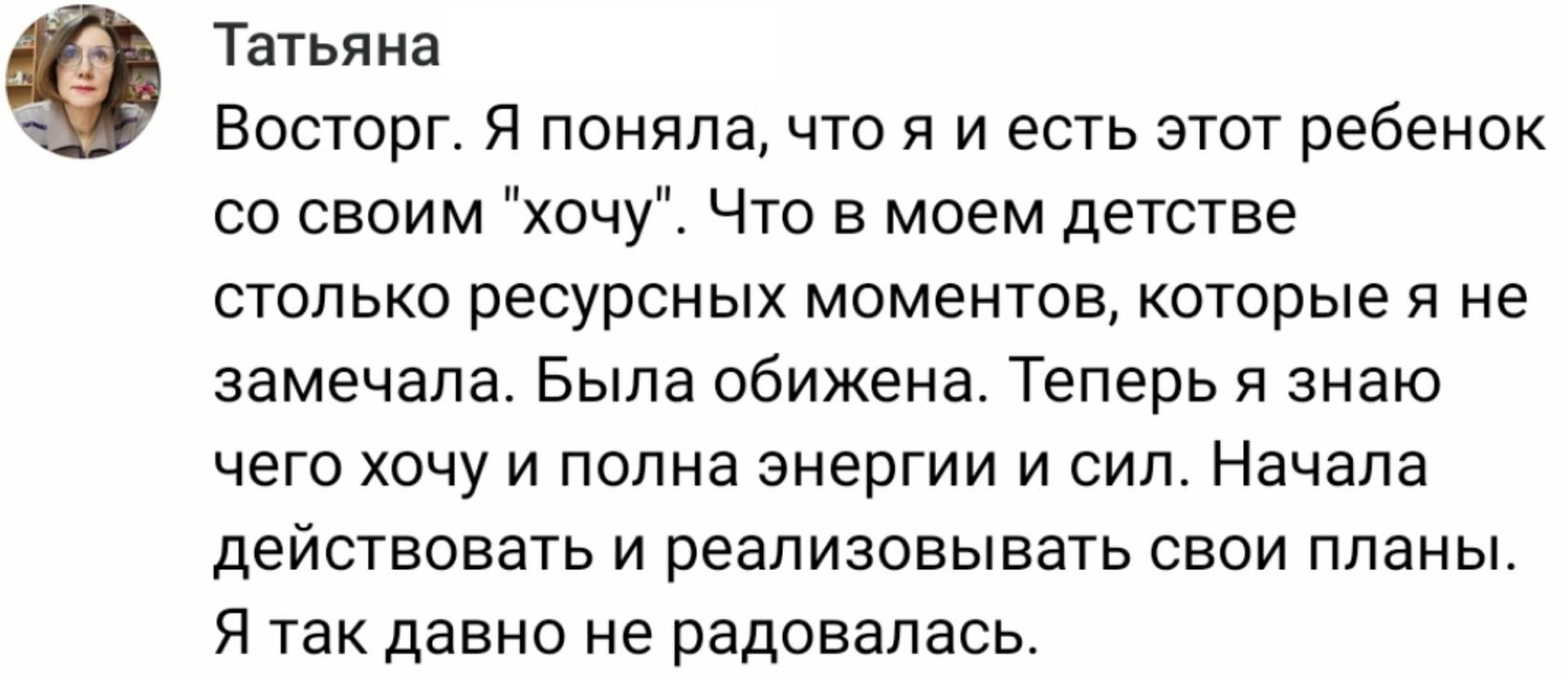 Восторг. Я поняла, что я и есть этот ребенок со своим "хочу". Что в моем детстве столько ресурсных моментов, которые я не замечала. Была обижена. Теперь я знаю чего хочу и полна энергии и сил. Начала действовать и реализовывать свои планы. Я так давно не радовалась.